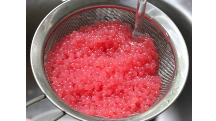 將成型的西瓜魚子醬顆粒倒出來,用純凈水沖洗掉表面多余的氯化鈣溶液;