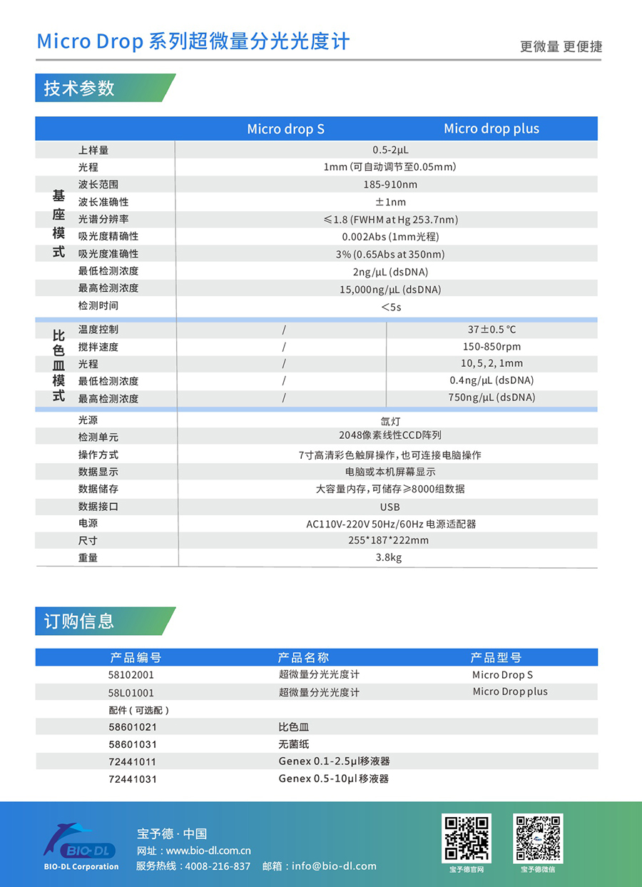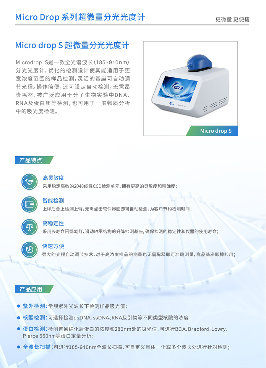 Microdrop plus超微量分光光度計是寶予德Microdrop的升級款,體積小巧,方便放置于各種空間能快速準確地檢測微量(0.5-2uL)樣品中目標物質(zhì)的吸光值,波長掃描范圍廣,通過其寬闊的觸摸屏可以輕松簡單地進行操作。它具有多種檢測模式,能夠輕松應對不同檢測實驗室中對樣本中DNA/RNA/蛋白質(zhì)等生物分子物質(zhì)的吸光度檢測。